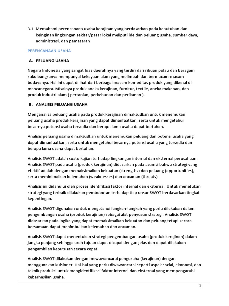 Ide dan peluang usaha kerajinan. Peluang usaha kain perca menjadi suatu bisnis terbuka lebar karena mesin dan desain bukan lagi hal yang mahal. Peluang usaha kerajinan pasar lokal masih terbuka lebar pasalnya persaingannya tidak begitu ketat dan anda dapat menentukan bisnis kerajinan ini dari barang barang di sekitar yang memiliki keunikan dan nilai jual. Persiapan yang dapat kalian lakukan dalam menganalisis peluang usaha sebagai berikut.Ancaman dan peluang selalu menyertai suatu usaha sehingga penting untuk melihat dan memantau perubahan lingkungan dan kemampuan adaptasi dari suatu usaha agar. Pada e book tersebut terdapat overview usaha cara pembuatan analisa ekonomi prospek usaha kisah suksesinovasi usahafaktor faktor kritis usahatips trik usaha contoh proposal usaha dan dilengkapi dengan matriks kualitatif peluang usaha untuk melihat kesesuaian usaha tersebut dengan faktor internal eksternal bpk. Menganalisis peluang usaha pada produk kerajinan dimaksudkan untuk menemukan peluang dan potensi usaha yang dapat dimanfaatkan serta untuk mengetahui besarnya potensi usaha yang tersedia dan berapa lama usaha tersebut dapat bertahan.