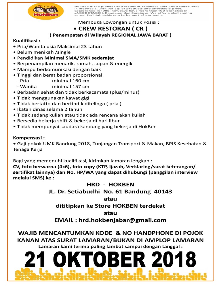 Lowongan kerja hokben 2020. Terbaru lowongan kerja di pemerintahan kementerian bappenas dan bpkp gaji 5 8 juta anda berminat. 11506 lowongan kerja part time hokben jakarta bulan juni 2020sebanyak 11506 lowongan kerja jakarta dan yang berhubungan dengan loker part time hokben jakarta rekrutmen part time hokben jakarta peluang kerja part time hokben jakarta peluang berkarir part time hokben jakarta pekerjaan part time hokben jakarta di lokermyid. Crew restoran dibuka sampai 2512020 untuk penempatan regional jawa barat bandung dan purwakarta.