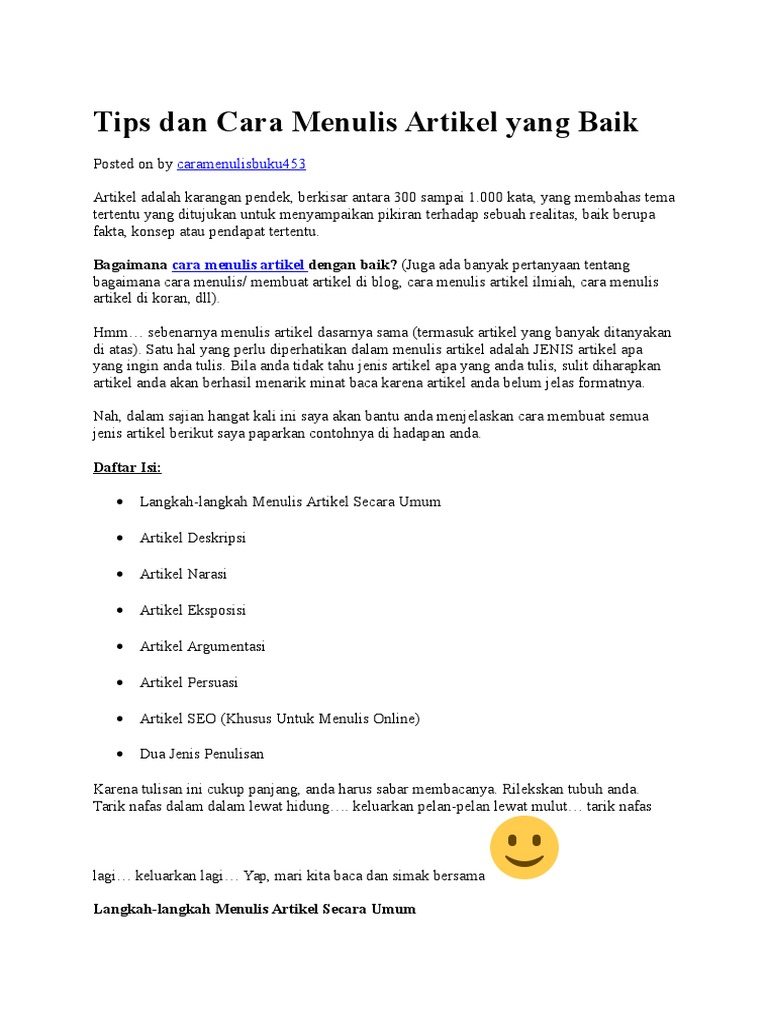 Cara membuat artikel ilmiah dan contohnya. Karena itu ketahui cara membuat artikel yang menarik dari awal mulai dari menentukan topikriset kata kunci membuat judul yang menarik hingga penutup. Keakuratan penulisan merupakan salah satu cara terbaik untuk membuat anda dikenal sebagai penulis artikel berita yang kompeten.