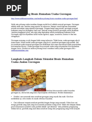 Usaha gorengan rumahan. Usaha yang satu ini juga tergolong usaha yang menjanjikan ya sobat karena pada umumnya masyarakat indonesia sangat gemar akan makanan ringan yang satu ini. Gorengan merupakan makanan ringan yang paling disukai banyak masyarakat di indonesia. 2454000 atau mungkin bisa kurang atau lebih.
