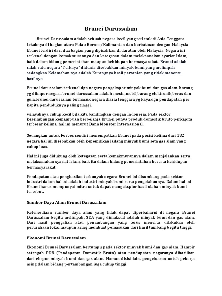 Gas bumi dan minyakPopulasi penduduk Brunei adalah 301000 12 Rumusan Masalah a. Pada tahun 2000 Per Kapita Keluaran Negara Kasar GDP bagi Negara Brunei Darussalam adalah kira-kira B23600 US13880. Hasil utama perkebunan di Brunei yang diekspor antara lain karet kelapa nanas sagu dan lada.