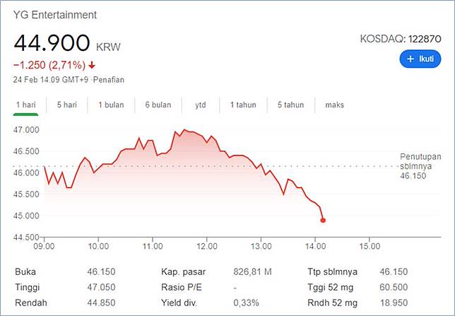 Entertainment Co dalam 3 jam trading terakhir dan juga memberi data penting seperti perubahan harian harga tertinggi dan terendah. Dikutip dari Kontacoid pada 11 Januari 2020 lalu menuliskan bahawa saham YG merupakan satu-satunya perusahaan yang mencatatkan hasil positif sepanjan 2020. Saat ini saham YG Entertainment bernilai 44700 won atau setara dengan 56556571 rupiah.